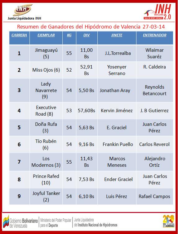 GANADORES EN EL HIPODROMO DE VALENCIA EL JUEVES 27 DE MARZO
