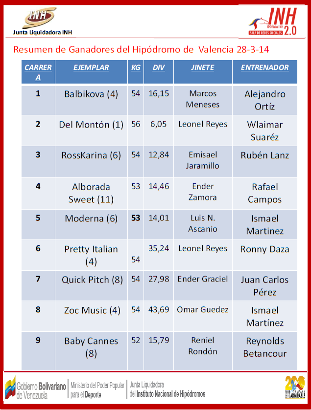 GANADORES EN EL HIPODROMO DE VALENCIA EL VIERNES 28 DE MARZO